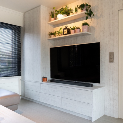 Heel tevreden van de totaalinrichting: inbouwkasten, tv-meubel, salon en de inlijstingen. Topservice!