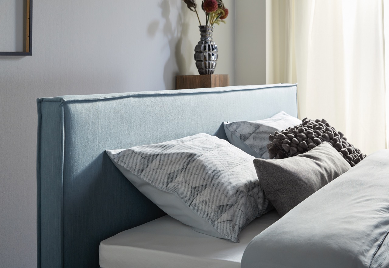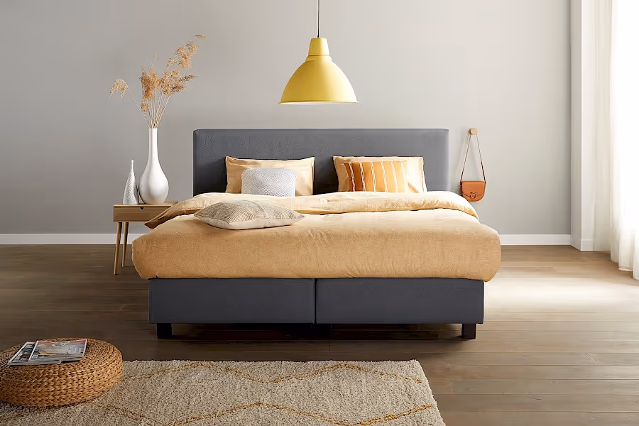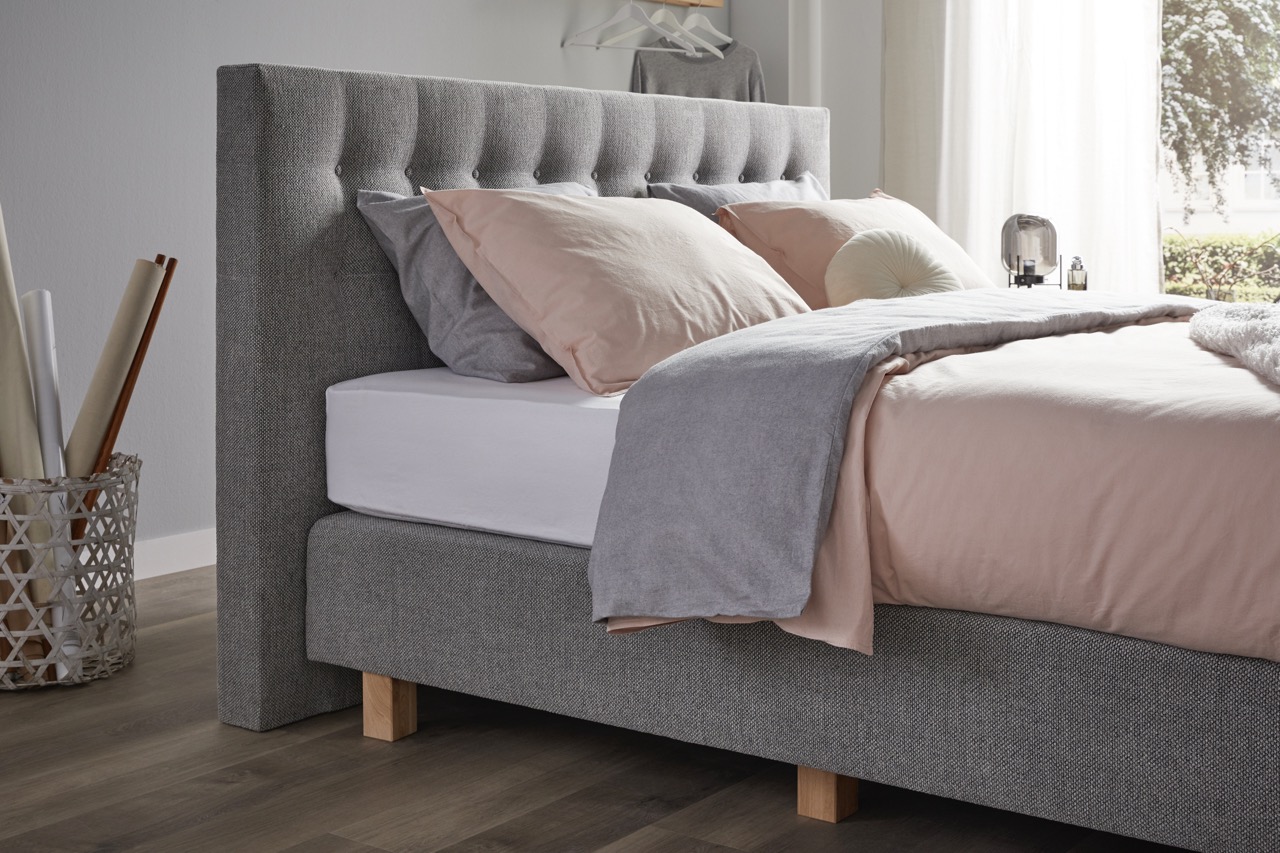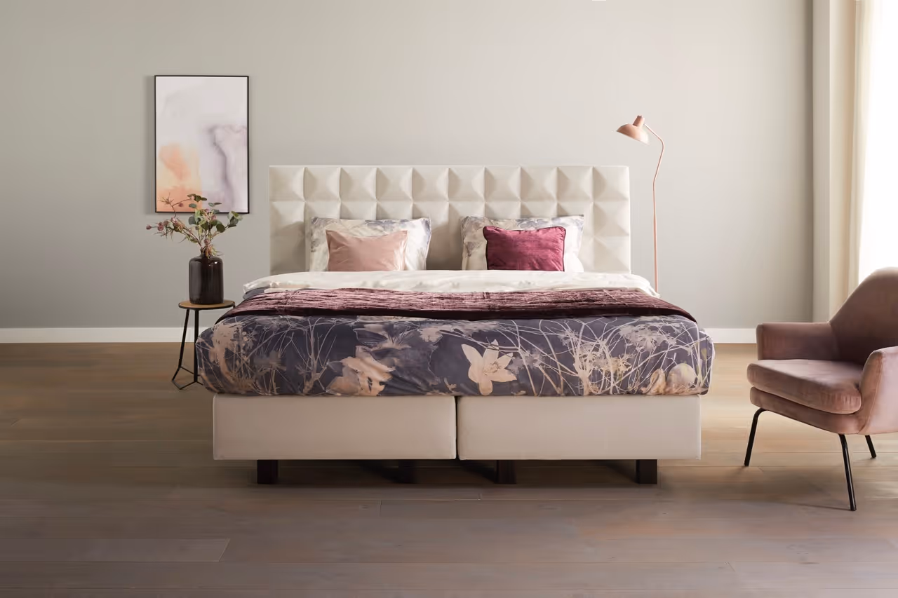 boxspring vast met 7-zone pocketvering hoofdbord: kubic, kubic met knopen, select of twist poten: houtenblokpoten of stiletto hoekpoot 7- zone pocketveringsmatras met HR 40 afdekking en verkoelende Thermogel hoes (H21) matras mogelijk met afneembare rits of vaste hoes en handgrepen verkrijgbaar in stof of lederlook