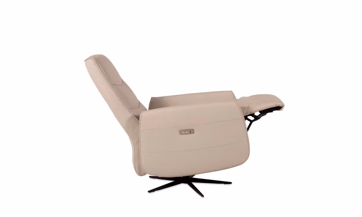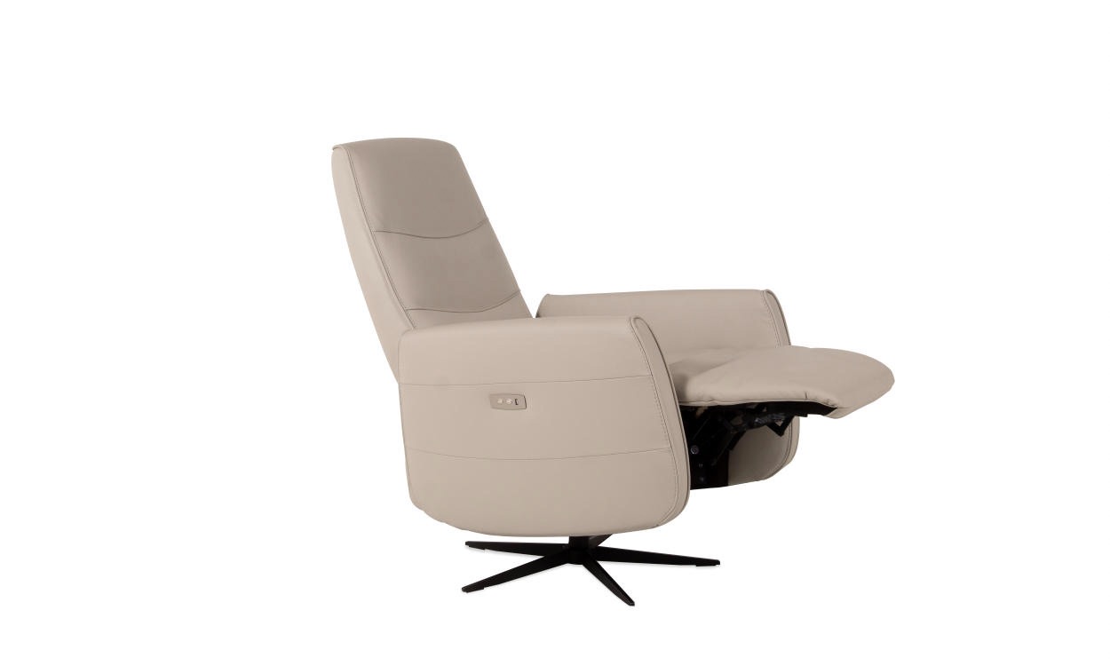 Moderne relaxfauteuil op een pivoterende stervoet in stof of leder tegen meerprijs Batterij (los) / knopbediening / usb-aansluiting / Manuele mechaniek / elektrische mechaniek 1 motorig / elektrische mechaniek 2 motorig / standaard manuele verstelbare hoofdsteun Breedte / Hoogte / Diepte: 69cm x 113cm x 86/160cm